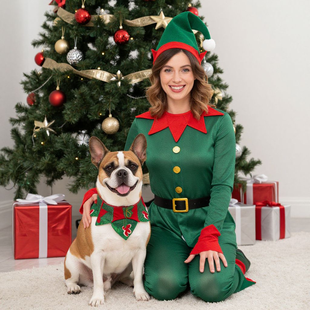 Photograph of a smiling woman in a green elf costume kneeling beside a brown and white dog wearing a matching elf outfit, in front of a decorated Christmas