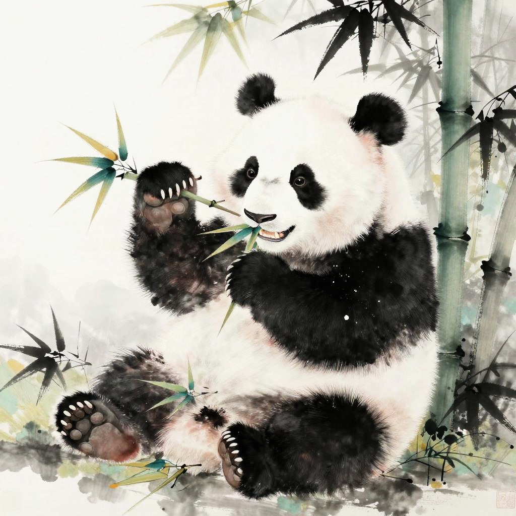 Chinese painting, a panda bear eating bamboo, clumsy, funny, cute, highly realistic artwork, 8k, masterpiece, award winning art, Chinese ink