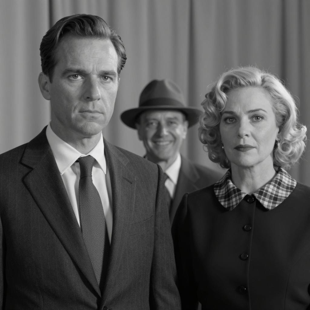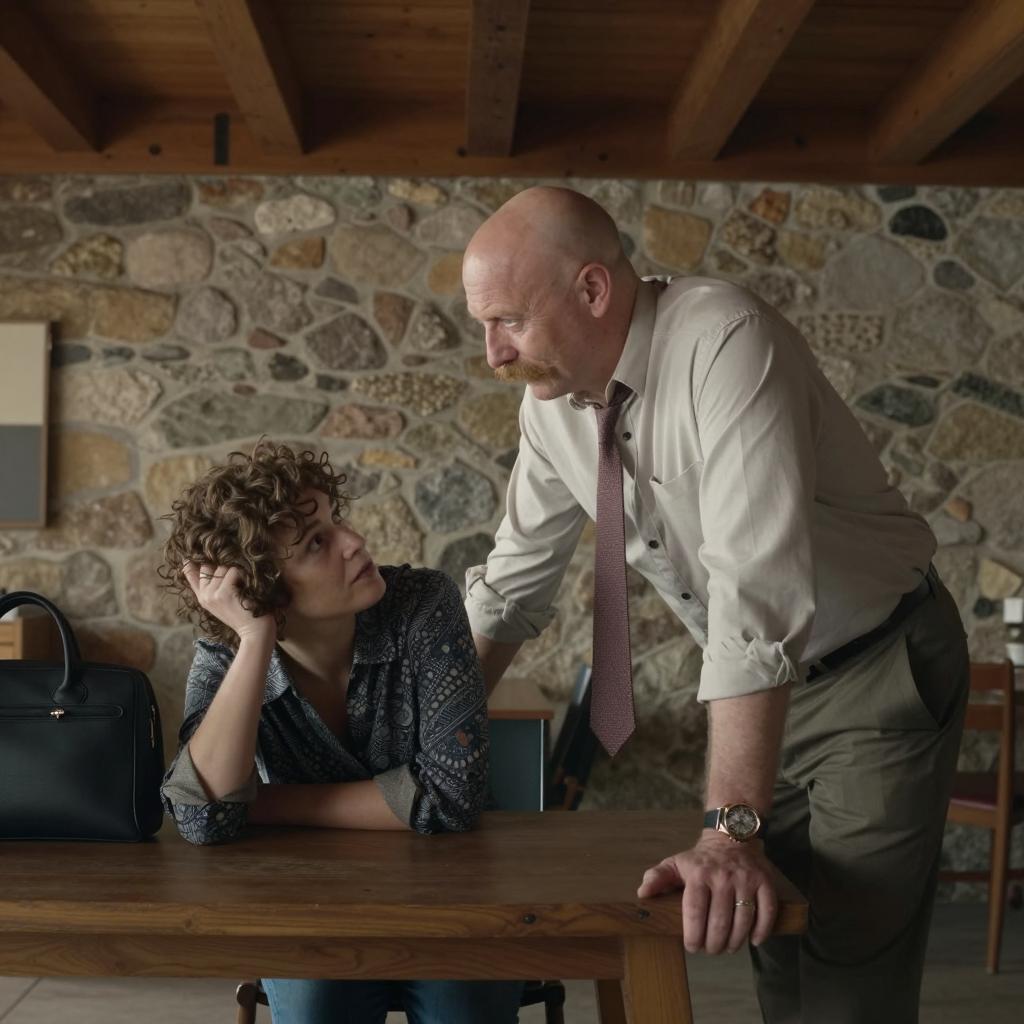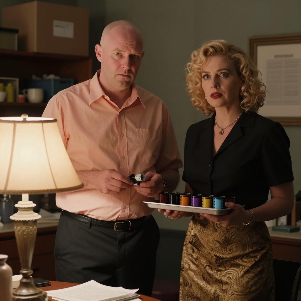 Photograph of two people in a dimly lit room. A man with a bald head, medium build, and light skin wears a peach shirt and black pants, holding a roll of film. A woman with curly blonde hair, medium build, and light skin wears a black top and gold patterned skirt, holding a tray of film. A vintage lamp with a cream shade is in the foreground on the left. Cardboard boxes and shelves with items are in the background. The woman stands to the right of the man. Both have intense expressions.