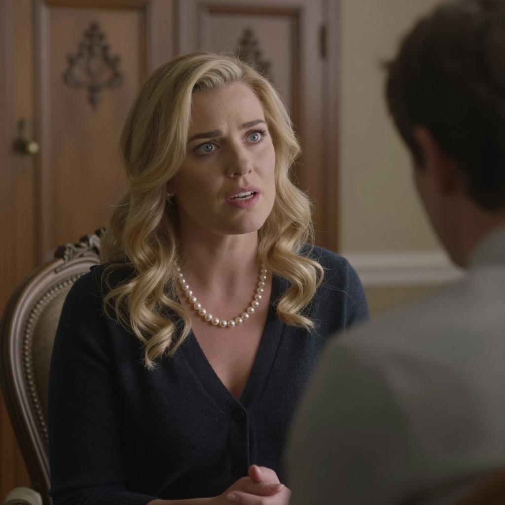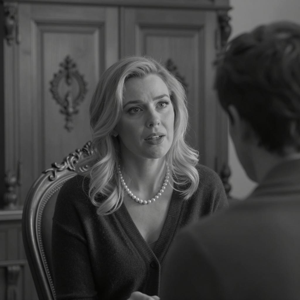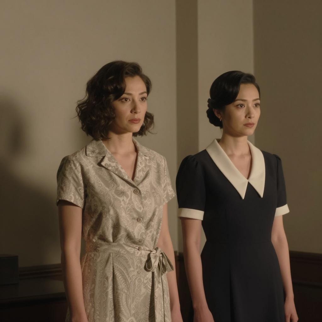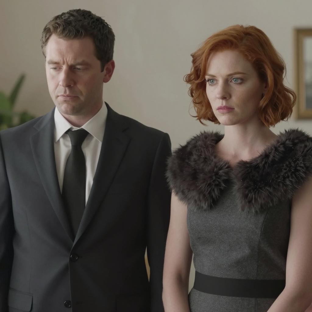 Photograph of two people in a dimly lit room. A man with a bald head, medium build, and light skin wears a peach shirt and black pants, holding a roll of film. A woman with curly blonde hair, medium build, and light skin wears a black top and gold patterned skirt, holding a tray of film. A vintage lamp with a cream shade is in the foreground on the left. Cardboard boxes and shelves with items are in the background. The woman stands to the right of the man. Both have intense expressions.