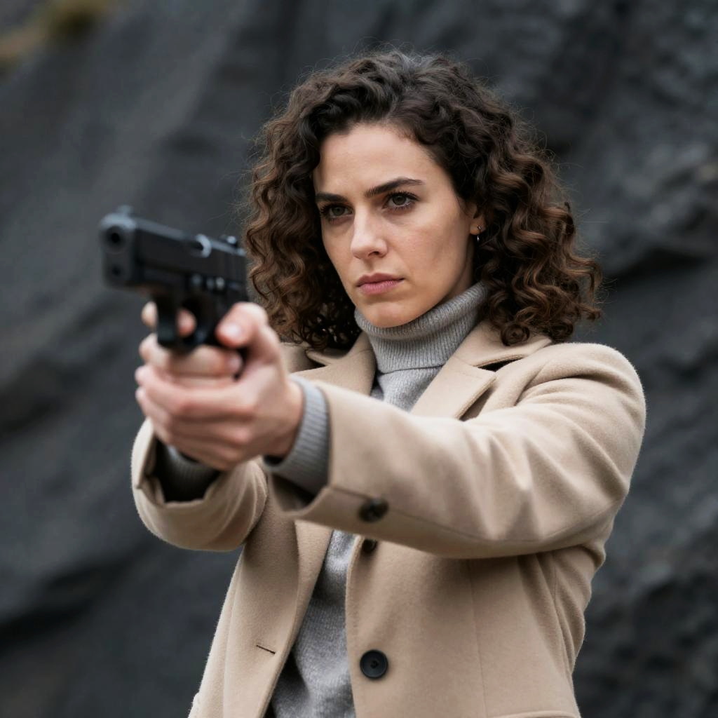Photograph of a person with intense expression, curly brown hair, and red lipstick, wearing a black studded leather jacket. They are pointing forward with a glowing, fiery orb in their right hand. Smoky gray background. Person is centered, facing forward.