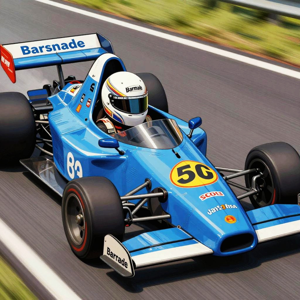 Blue racing suit, stylized illustration of retro 80s race car driver mid-race, vivid blue fabric with wrinkles and sponsor logos, vibrant color palette, comic book style