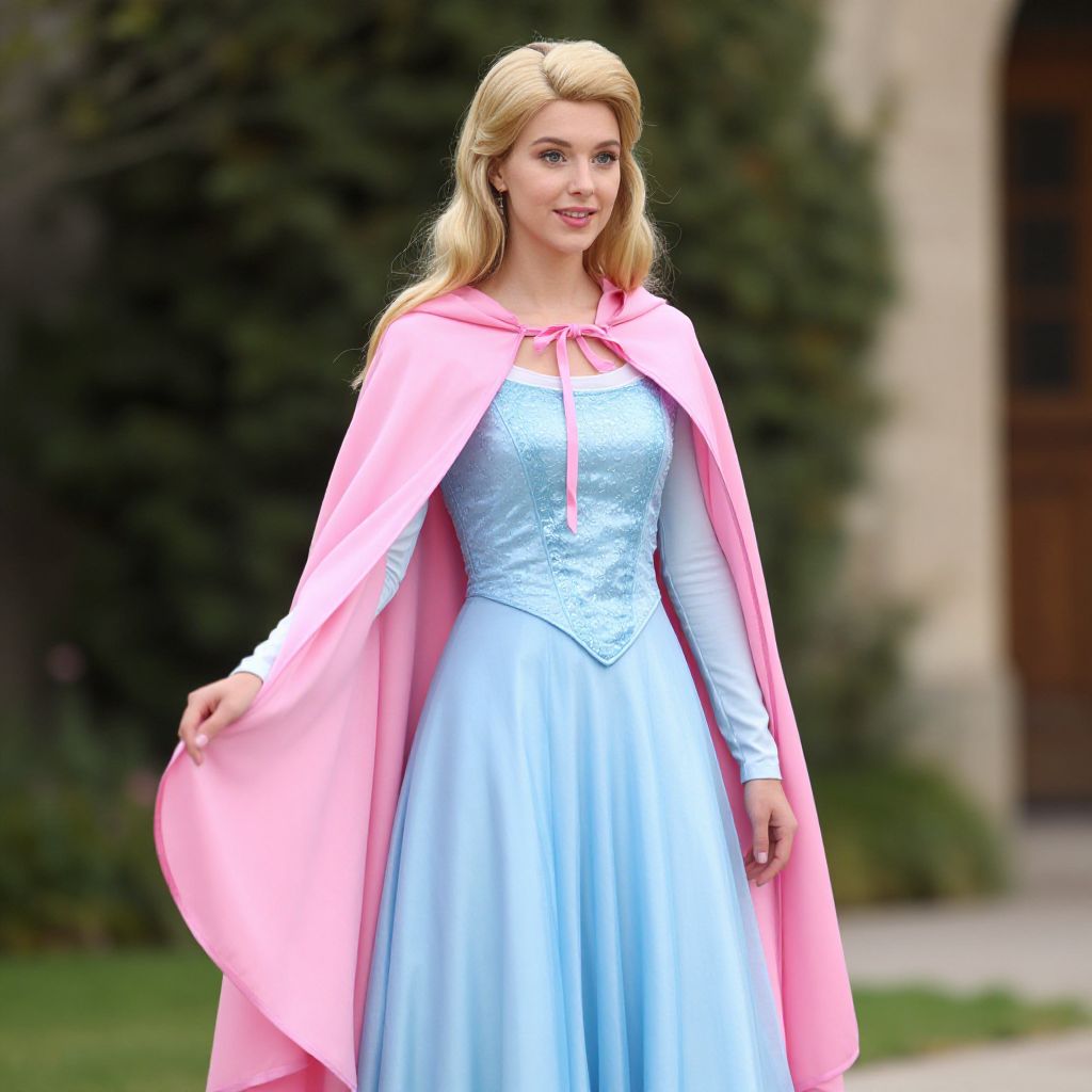 Photograph of a blonde woman dressed as Cinderella in a light blue dress with a pink cape, standing outdoors with blurred greenery and a building in