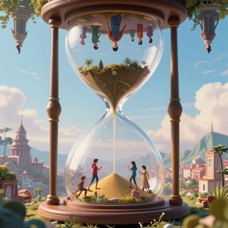 Within the ethereal confines of a colossal hourglass, a vibrant civilization flourishes upside down, its citizens traversing inverted skies under the soft hum of time's eternal flow, embodying the paradoxical dance between transience and resilience.