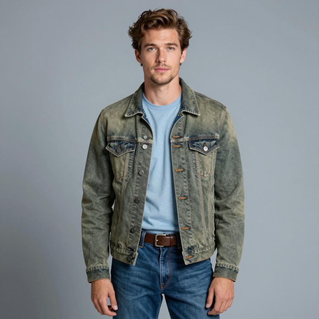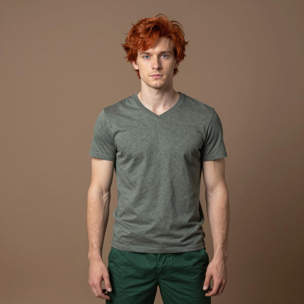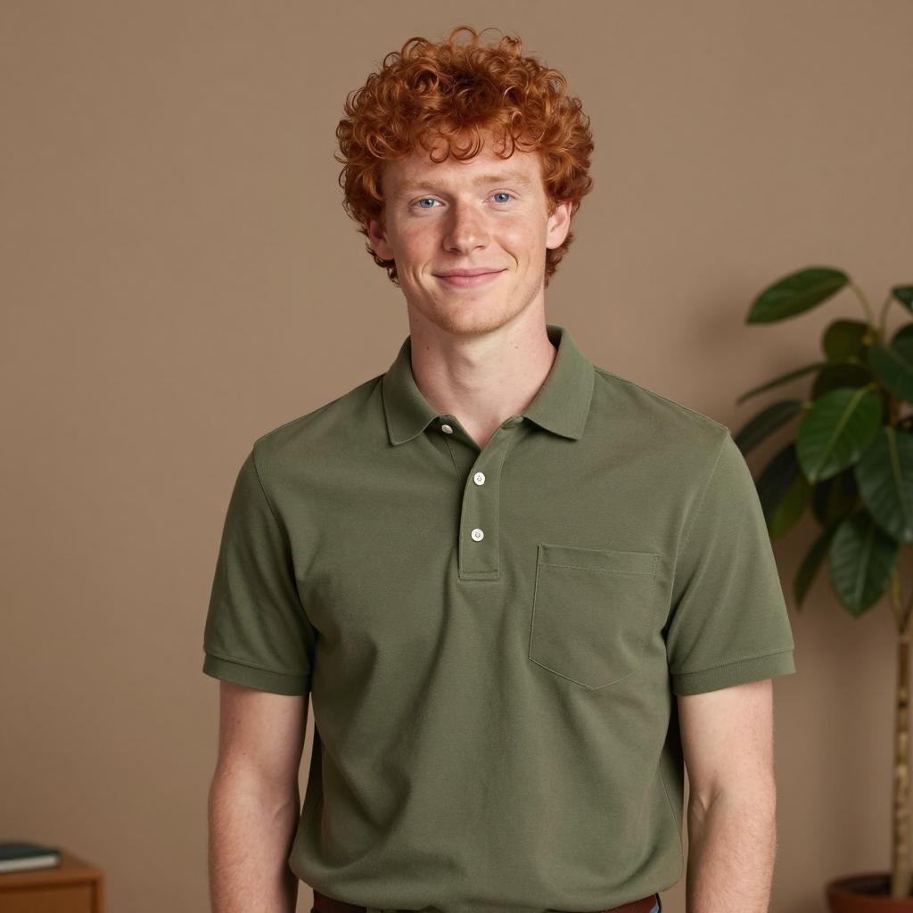 Fred wig scooby doo, photorealistic, portrait of young man with curly red hair, blue eyes, wearing olive green polo shirt with pocket, standing against soft brown background, slight smile, casual setting, 80s style, studio lighting, green plant on right, SD/T2I, digital photography
