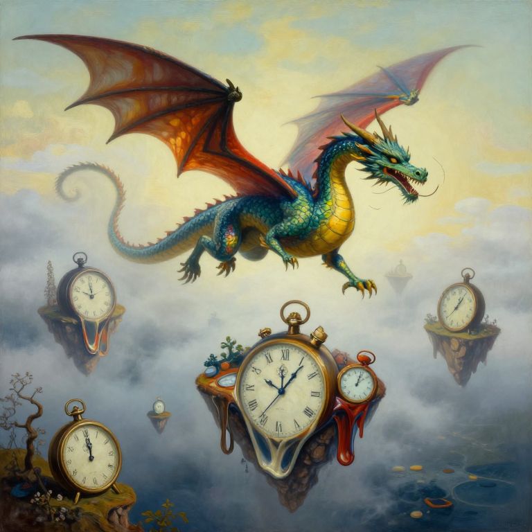 A surreal oil painting depicting a majestic dragon soaring through a misty, ethereal landscape inspired by the whimsical unpredictability of Dali's melting clock concept. From an aerial perspective, the awe-inspiring creature navigates between floating islands composed of unique amalgamations of timepieces from various eras. The dragon's scales reflect the vibrant colors of its surroundings, creating an emotional gradient that ranges from tranquility to wonder. This captivating scene merges the power and mystery of dragons with the iconic surrealism of melting clocks, inviting viewers on a visually striking journey through the realms of imagination.