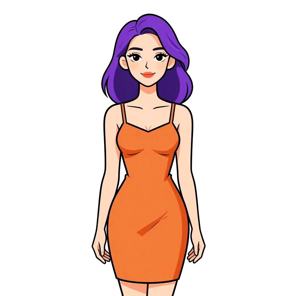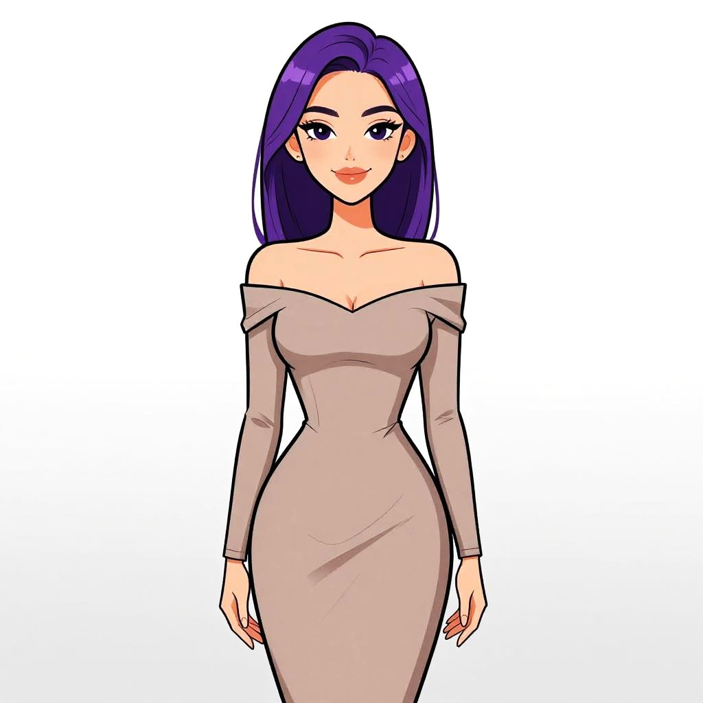 Illustration of a young woman with purple hair and a pretty face, wearing a contemporary casual off-the-shoulder long sleeve mini dress. The dress features horizontal gray and white stripes, is form-fitting, and made of light fabric. The background is plain white.