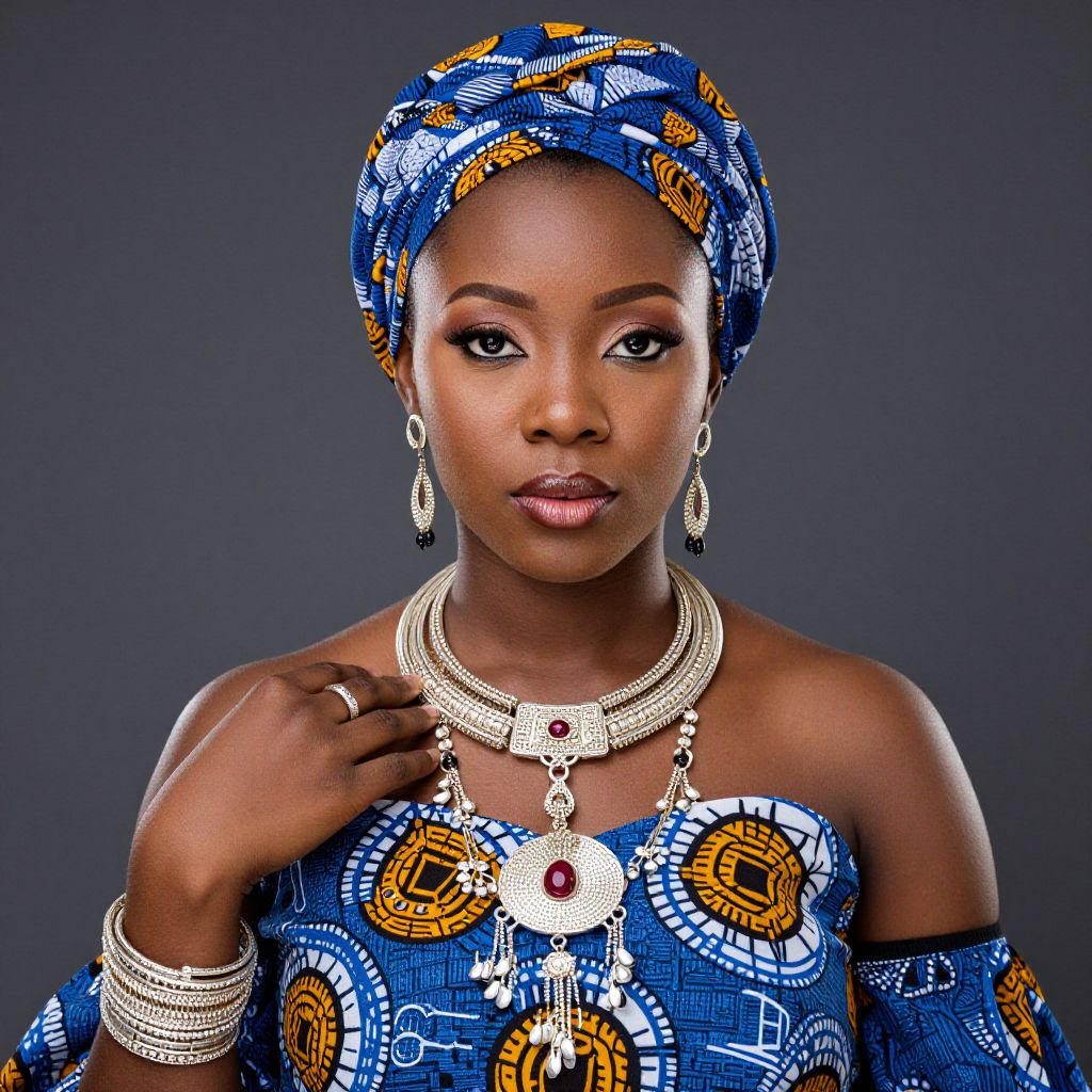 Photograph of a dark-skinned African woman wearing a blue and yellow patterned dress, headwrap, and elaborate jewelry, against a dark gray background