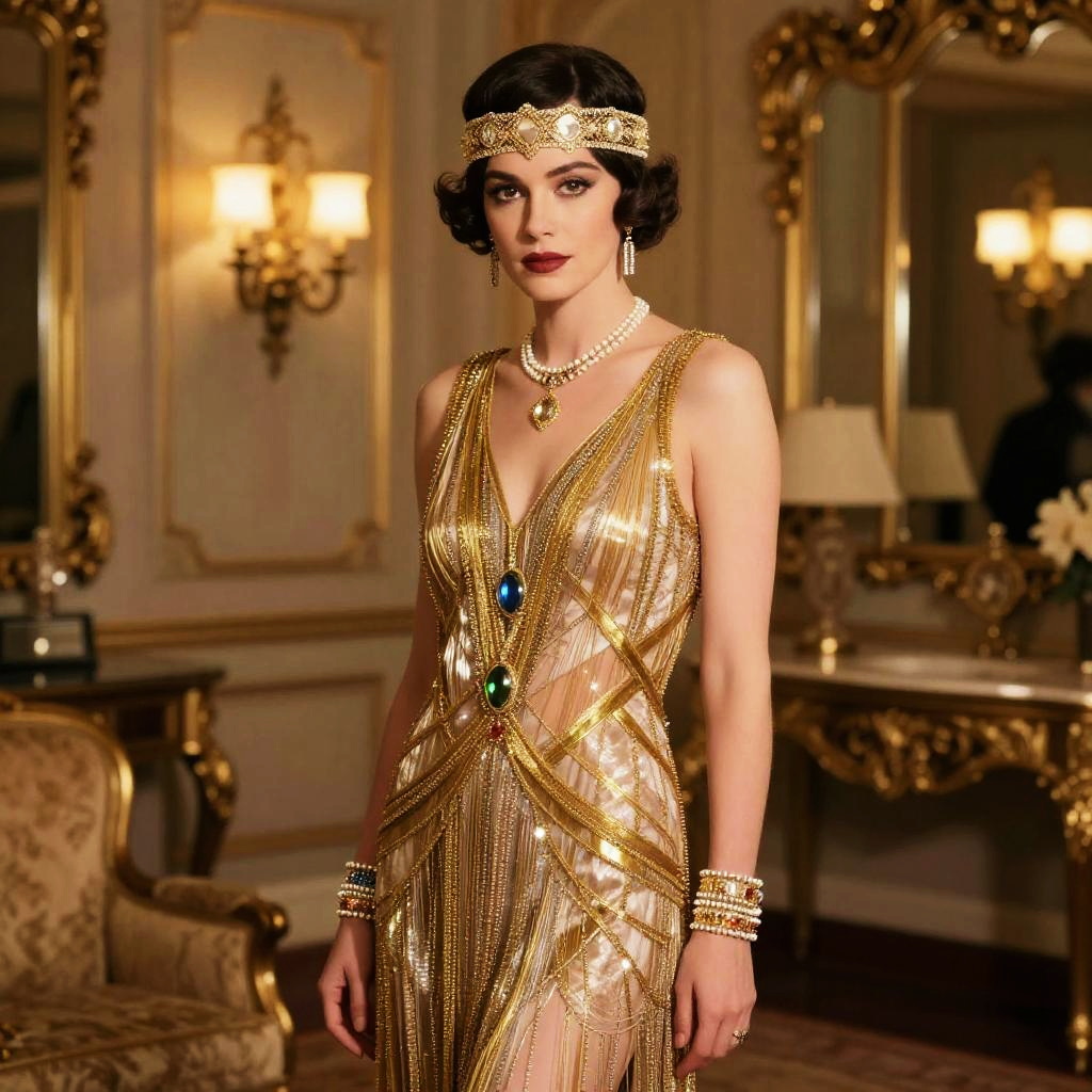 An elegant woman dressed in a Great Gatsby style gown exudes sophistication and charm amidst a luxurious vintage setting, embodying the exquisite fashion of the Roaring Twenties.
