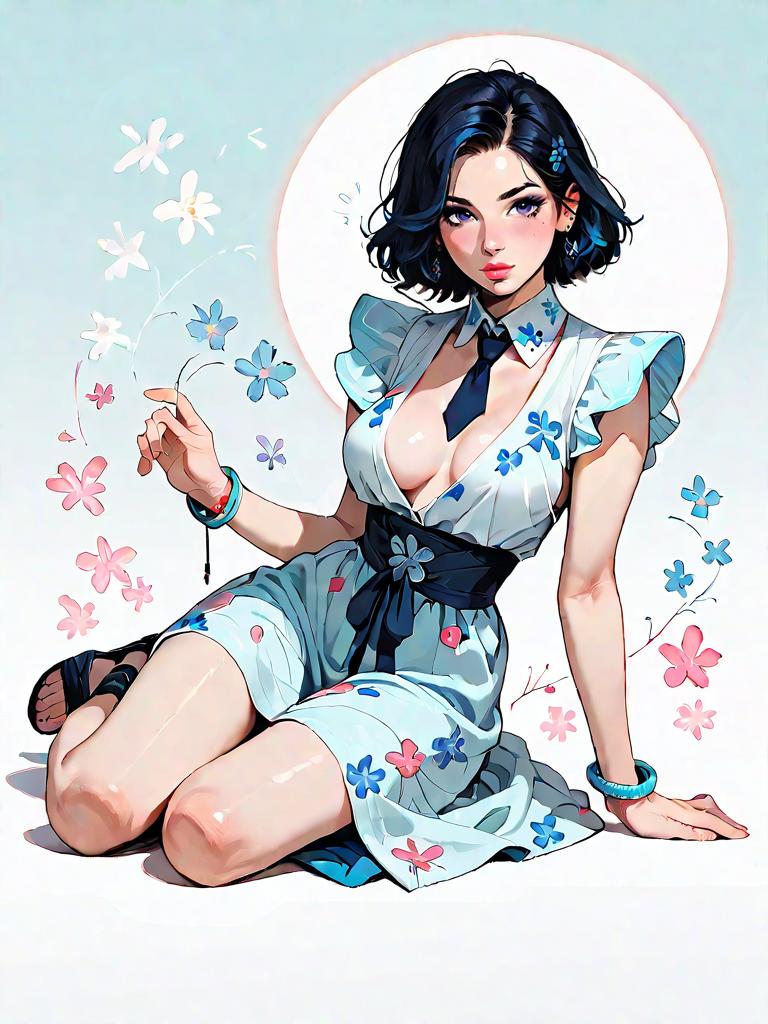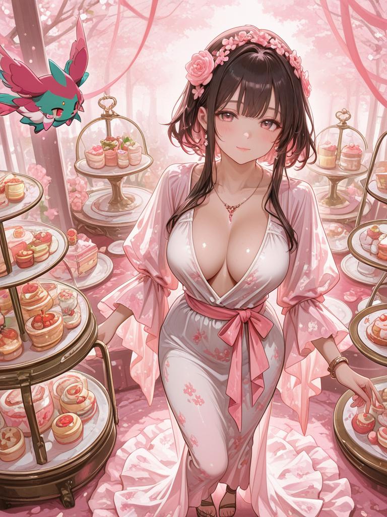A realistic anime-style illustration of a young woman with dark hair adorned with pink flowers, wearing a blush pink chiffon maxi wrap dress featuring a plunging neckline, flutter sleeves, and an adjustable waist tie. She stands gracefully surrounded by tiered trays filled with assorted delicate desserts in a soft pink, floral-themed setting. The scene blends elements of elegance and sweetness with a gentle, warm atmosphere.