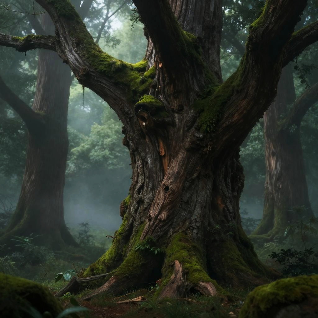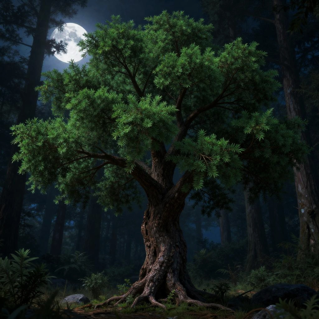 Shimmering silver pine in a mystical forest, pastel drawing, rough textured bark, icy blue winter foliage, enchanted snowy forest ambiance, high detail, magical realism, cool soft moonlight
