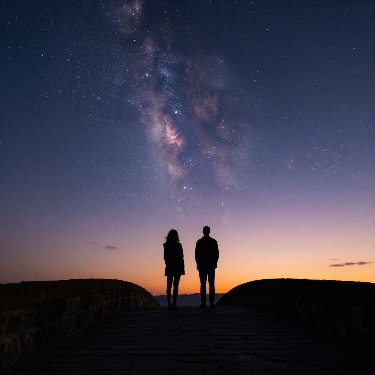 Silhouettes stand upon a bridge of stone and starlight, their forms a quiet testament to shared solitude, as the fading sun whispers secrets of transience beneath a sky alive with cosmic wonder.