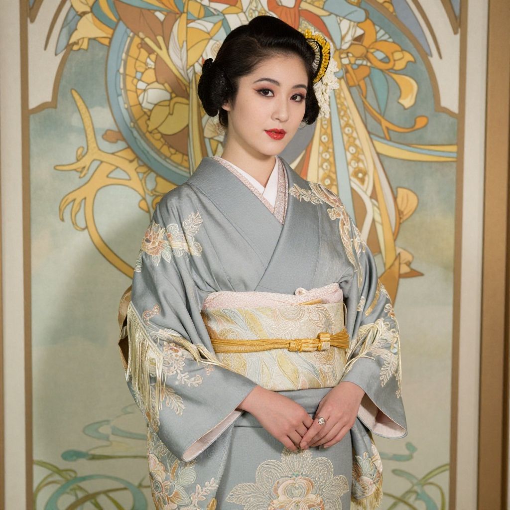 Photograph of an Asian woman in a light blue, floral-patterned kimono with a gold obi, standing before an ornate, decorative background