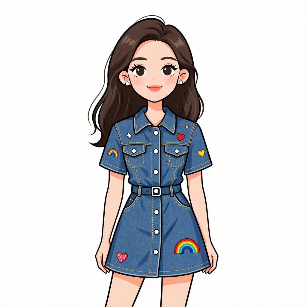 Digital anime-style drawing of a cute young woman with long brown hair, wearing a blue denim dress with rainbow and heart patches.