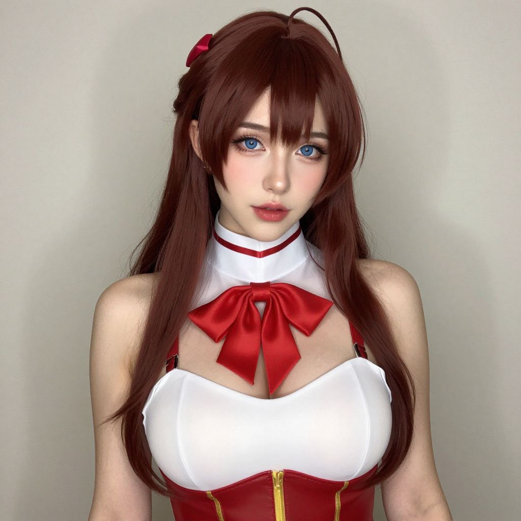 Sexy cosplay woman character wearing Cure Rouge (Rin Natsuki) costume. Realistic photo. Jane Doe dressed as Cure Rouge (Rin Natsuki). Realistic photo, caucasian woman, pretty cute face, very big breasts