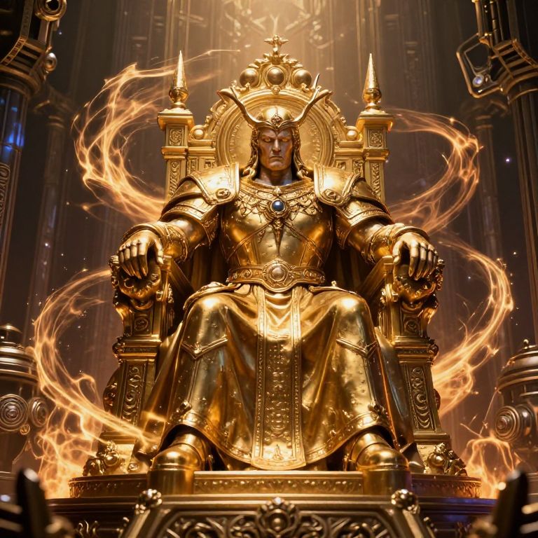 Warhammer 40k Emperor golden throne, towering figure seated on ornate golden throne, surrounded by swirling ethereal energy and arcane machinery, detailed baroque sci-fi elements, grim dark universe, dramatic lighting emphasizing power and divinity