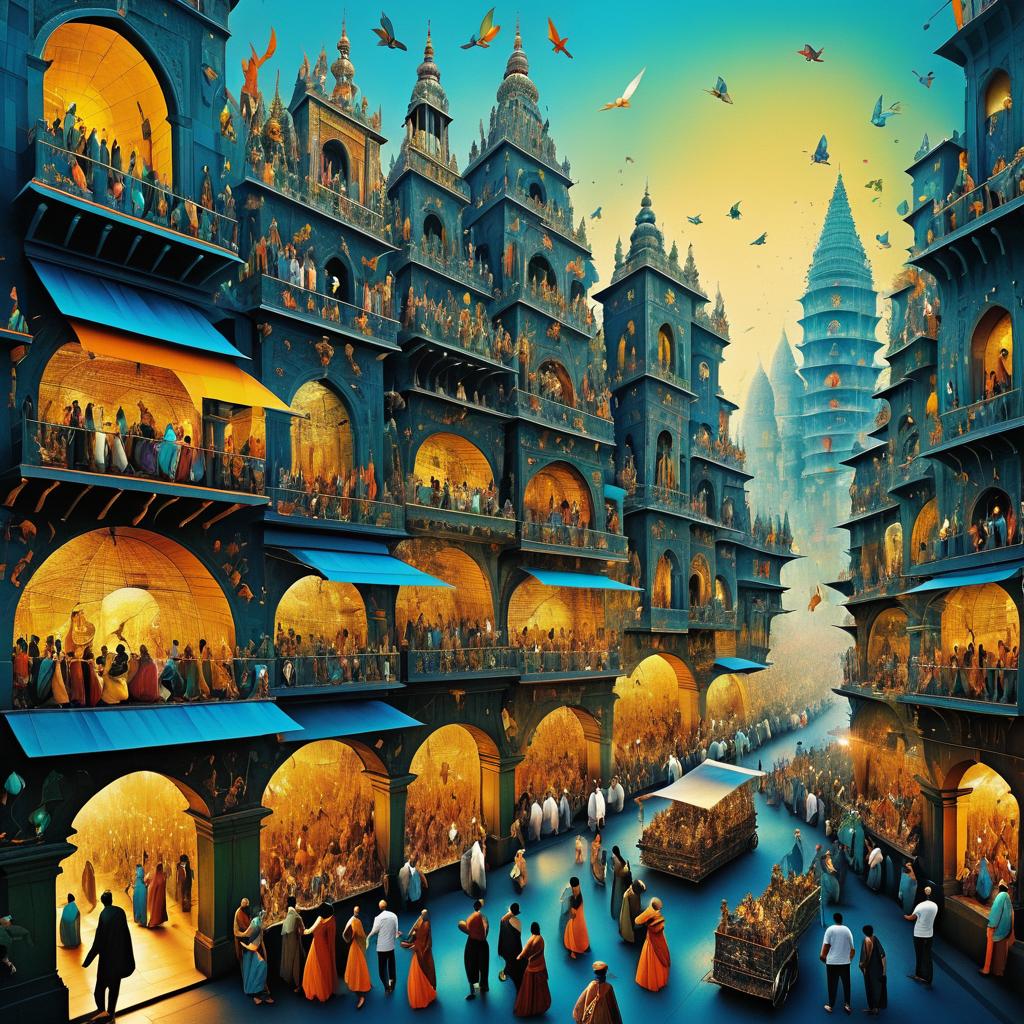 Hieronymus Bosch-style painting, cool colors, chaotic scenes, surreal elements, Mumbai, Bollywood glamour, intricate details, imaginative characters, bustling crowds, fantastical creatures, busy streets, dynamic urban landscape, dreamlike quality, rich textures, visually stimulating composition, high definition