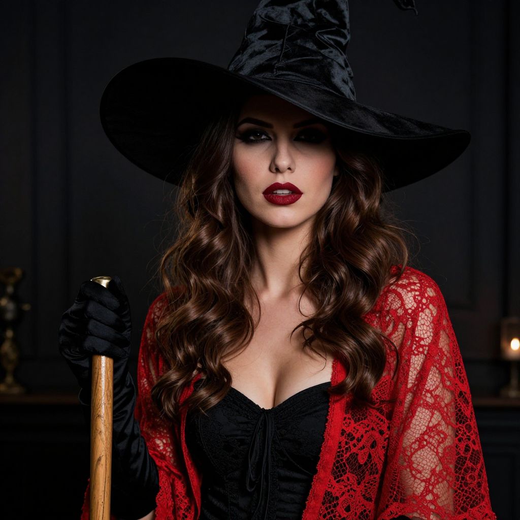 Photograph of a sultry woman with long, wavy brown hair, wearing a large black witch hat and a red lace shawl over a black strapless dress. She has dark, dramatic makeup with bold red lipstick, and her eyes are slightly hidden in shadow. She's holding a wooden cane with a black-gloved hand, set against a dark, mysterious background that looks like a dimly lit room.