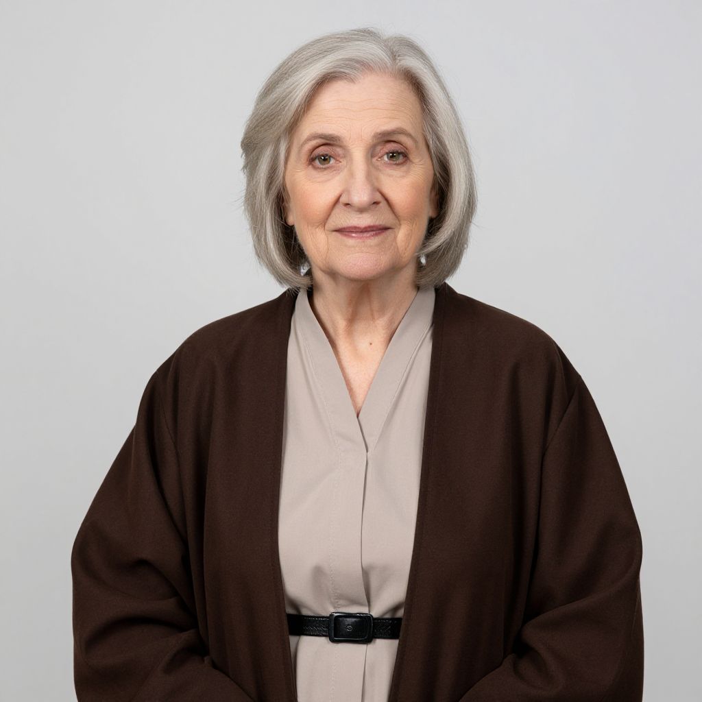 Photograph of an elderly white woman with short white hair, wearing a brown blouse and high-waisted brown skirt, standing in a blurred urban street