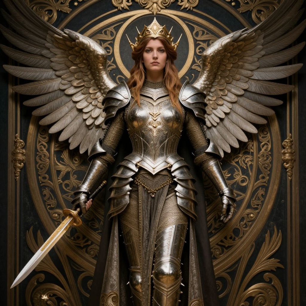 Photorealistic digital artwork of a stern, fair-skinned, red-haired woman with large, golden-feathered wings, wearing ornate, silver-gold armor with intricate engravings. She holds a gleaming sword in her right hand and wears a crown adorned with jewels. Her expression is solemn, and she stands against an elaborately carved, dark, ornate background with swirling patterns and a gold circle behind her head. The image combines elements of medieval fantasy and gothic art styles, emphasizing her powerful and regal presence.