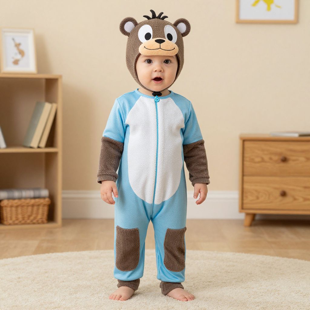 Infant Curious George Costume, small child dressed in a costume standing in a room