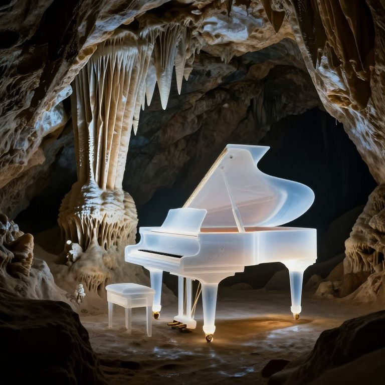 A luminous, translucent piano emerges from the depths of a cavern, its ethereal glow illuminating cascading stalactites and transforming the rocky landscape into a symphony of light and shadow.