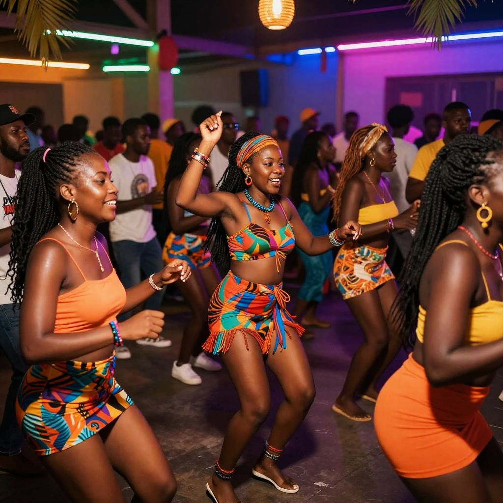 Mandingo party scene vibrant and lively, featuring energetic crowd dancing under neon lights, dynamic colorful outfits, tropical decorations, cinematic lighting, ultra-detailed, festive atmosphere