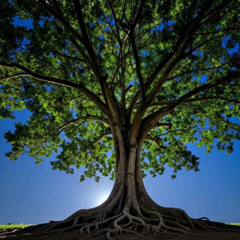 A majestic, sprawling tree stands rooted firmly in the earth, its gnarled trunk and intricate roots anchoring it to the ground, while its lush canopy stretches upward toward a starlit sky, creating a mesmerizing contrast between the terrestrial and celestial realms.