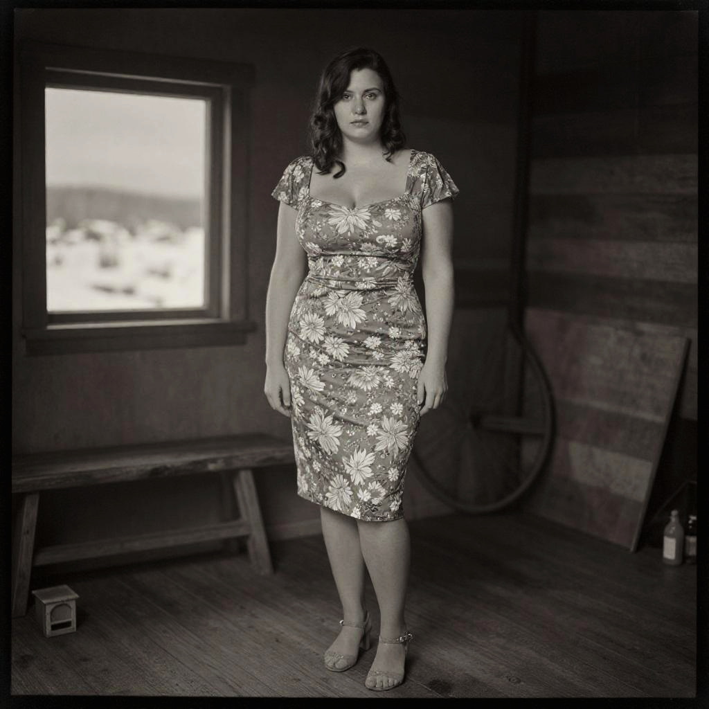 A stocky woman in a knee-length floral bodycon dress with short sleeves and strappy open-toe heels, captured in the soft, nostalgic tones of the Calotype process, stands in a cozy cabin on a snowy plain. Sexy. Pretty face and beаutiful eyes. Big breasts