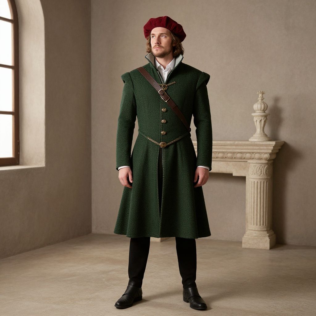 Noble Renaissance Man Costume, man in a red hat and green coat standing in a room