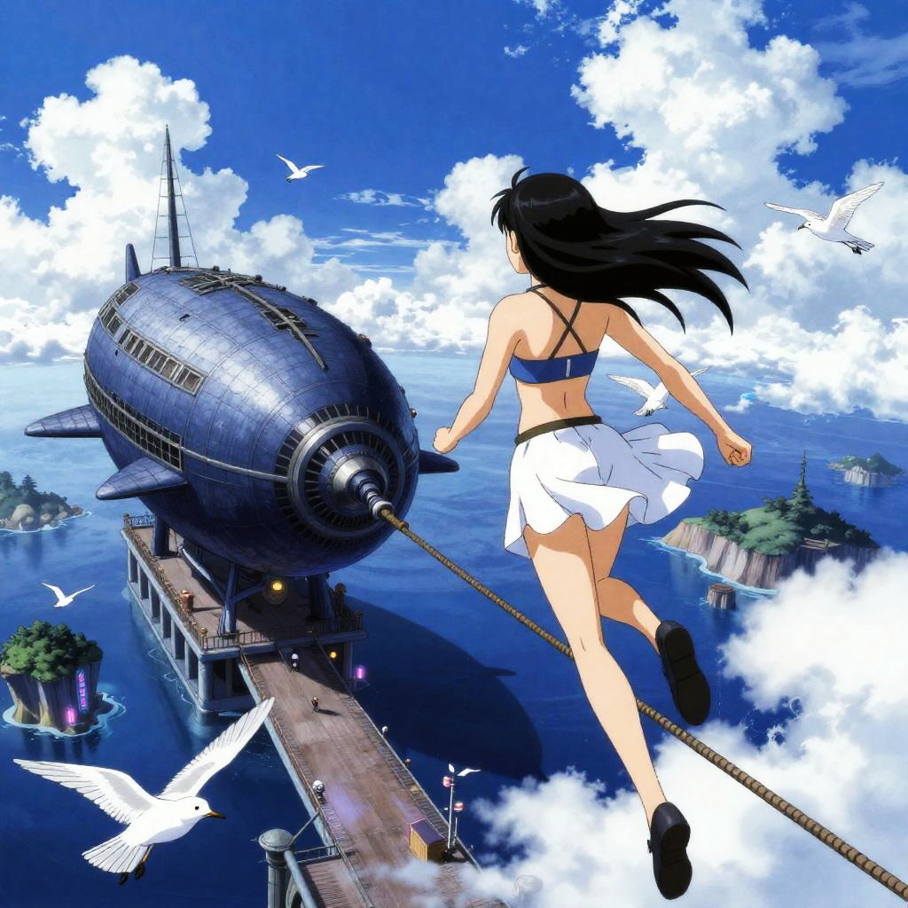 Skybound Swordswoman, Takeshi Obata, Surreal, mysterious, bizarre, fantastical, fantasy, sci-fi, Japanese anime, airship moored to an aerial wharf above a neon-lit archipelago, miniskirt beautiful swordsman running towards the airship on the tethered rope, perfect voluminous body, blue sky, clouds, detailed masterpiece bird’s eye views