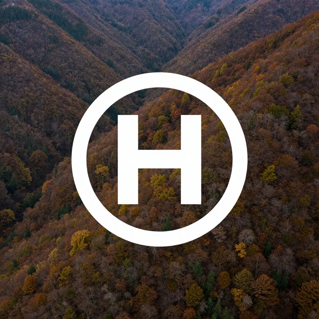 Aerial photograph of a dense, forested mountain range during autumn, showcasing a mix of brown, orange, and green foliage. A large, white, circular logo with a bold, white, uppercase letter "H" in the center is superimposed over the image. The logo and letter are highly contrasting against the dark, textured forest background. The image has a natural, slightly shadowed look due to the angle and time of day, likely taken during early morning or late afternoon. The logo appears to be digitally added to the photograph.