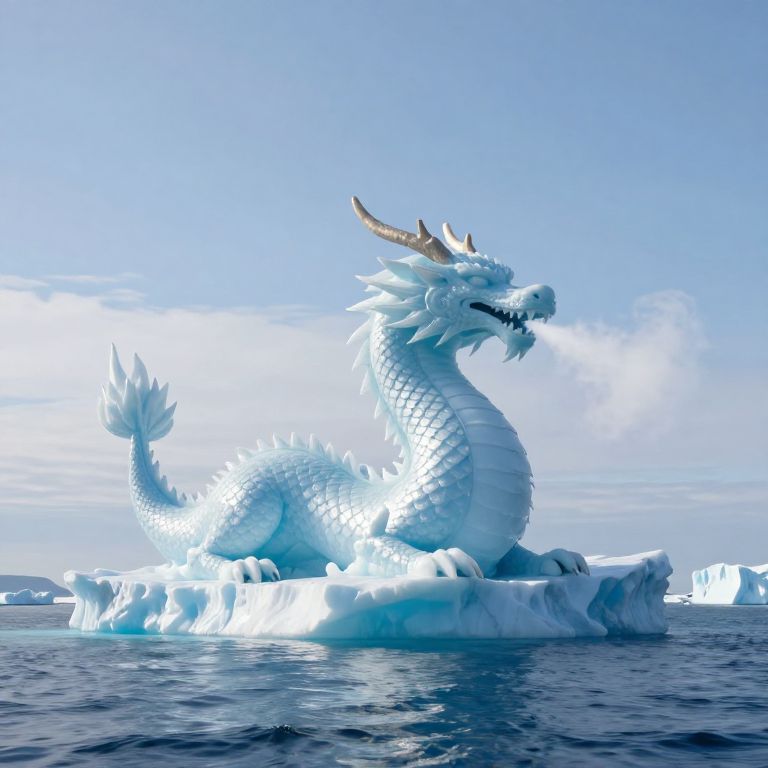 Dragon-shaped iceberg floats serenely across a calm ocean, its icy scales shimmering beneath the sunlight while emitting wisps of vapor from its nostrils, mirroring mythical dragon breath.