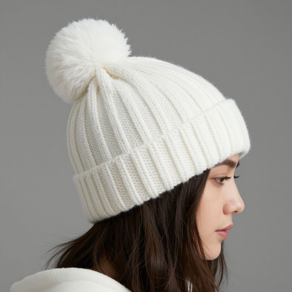 Woman wearing a cozy white ribbed knit beanie with a fluffy pom-pom atop her head, styled against a neutral background.