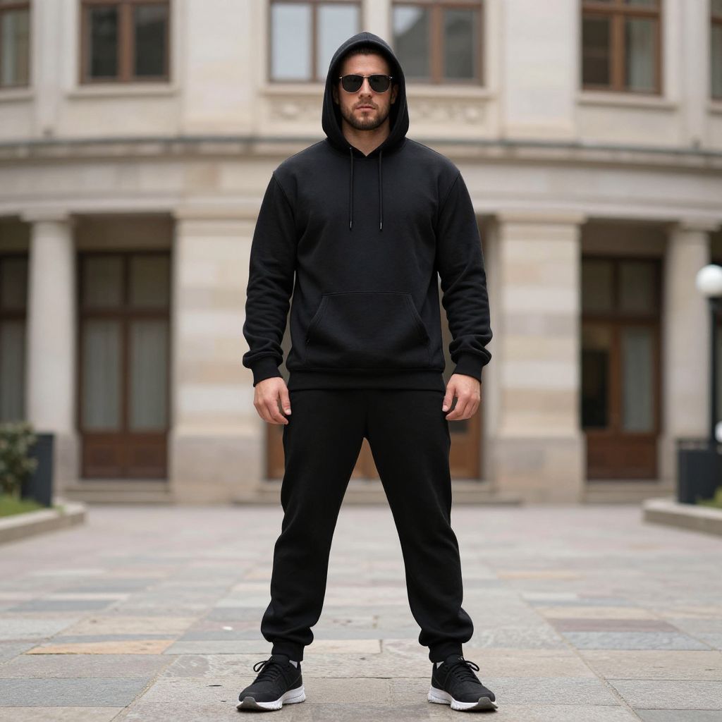 Photograph of a tall, muscular man standing in an urban courtyard. He wears a black hooded sweatshirt, black pants, and black sneakers with white soles. His beard is dark, and he sports black sunglasses. The background features a beige stone building with multiple windows and columns. The ground is paved with multicolored tiles. The man's hands rest by his sides, and his stance is confident. The overall style is modern urban fashion.