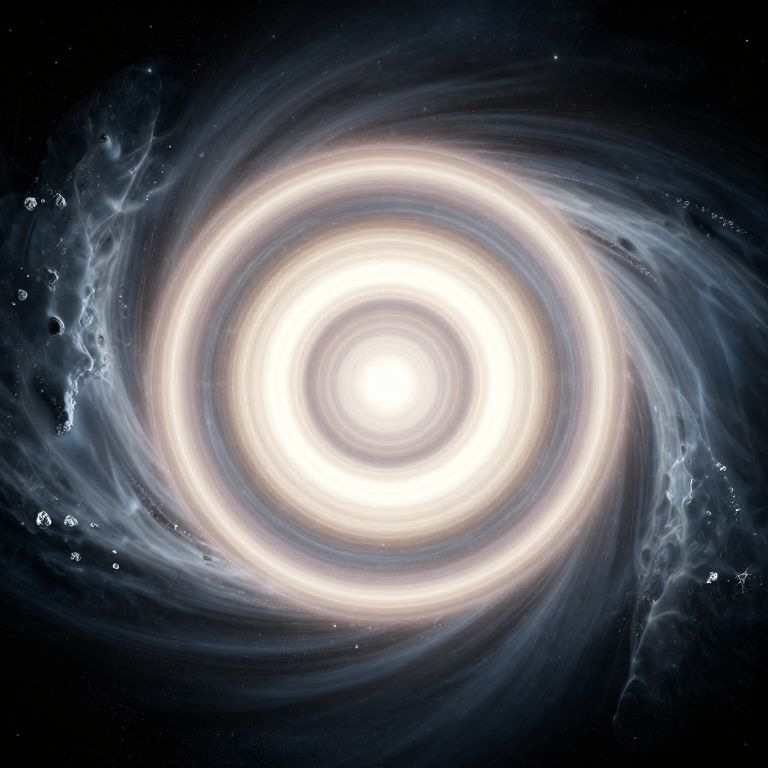 Digital artwork depicting a bright, white, glowing spiral galaxy viewed from above. The central core is extremely white and intensely luminous, surrounded by concentric rings of white and light blue, transitioning into darker blue and black at the outer edges. Swirling clouds of gas and dust are visible around the galaxy, adding texture and depth. The background is a deep, star-filled black space, enhancing the galaxy's brightness and spiral structure. The overall effect is ethereal and mesmerizing, highlighting the galaxy's dynamic and luminous nature.