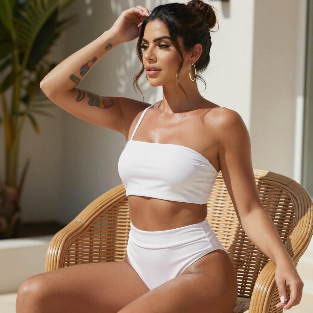 Photograph of a tan-skinned woman with long black hair, wearing a beige bikini, sitting on a white outdoor chair on a rooftop. She has a tattoo on her right hip, her eyes are closed, and her right arm is raised behind her head. The background includes a clear blue sky, modern buildings, and greenery.