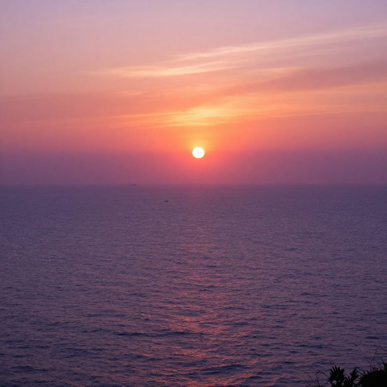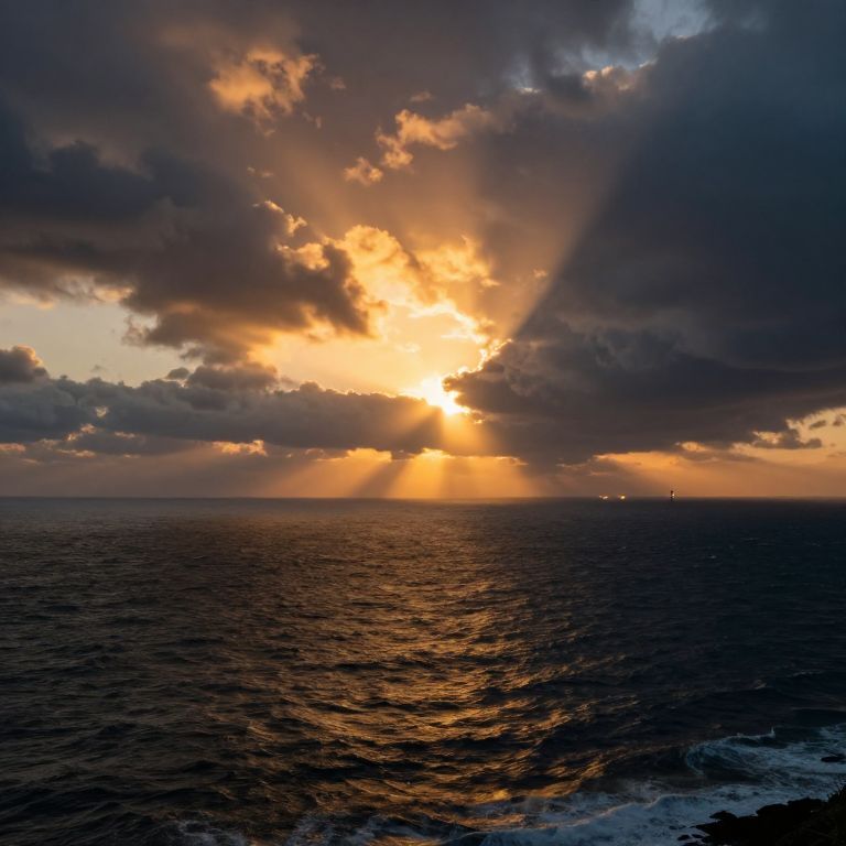 Sunset radiates vibrant rainbow beams across the horizon, its reflection transforming into a cascading cloud of golden particles that descend into the deep blue ocean below.