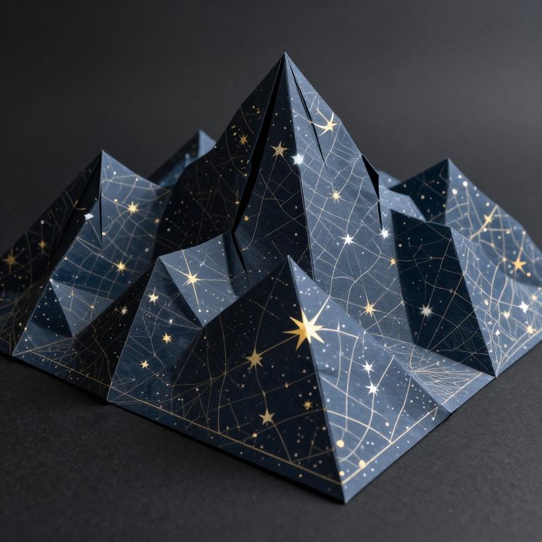 This photograph features a 3D geometric sculpture composed of multiple dark blue, triangular paper-like structures stacked to form a mountainous shape. The surfaces of the triangles are adorned with a constellation-like pattern, filled with small white and yellow stars and interconnected white lines, resembling a night sky. The sculpture is placed on a smooth, dark gray background, enhancing the contrast and making the constellation details stand out. The overall texture is sleek and modern, with a high level of detail and precision in the star patterns, giving the piece an elegant, celestial feel.