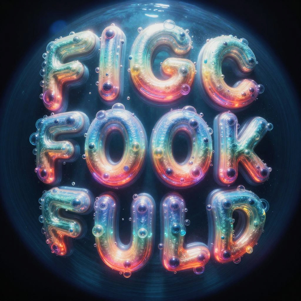 Fish eye font inspired futuristic typography, bubbly distorted letters with vibrant gradients, underwater theme, light reflections on letters, digital art style, high detail, neon colors, surreal and dynamic composition.