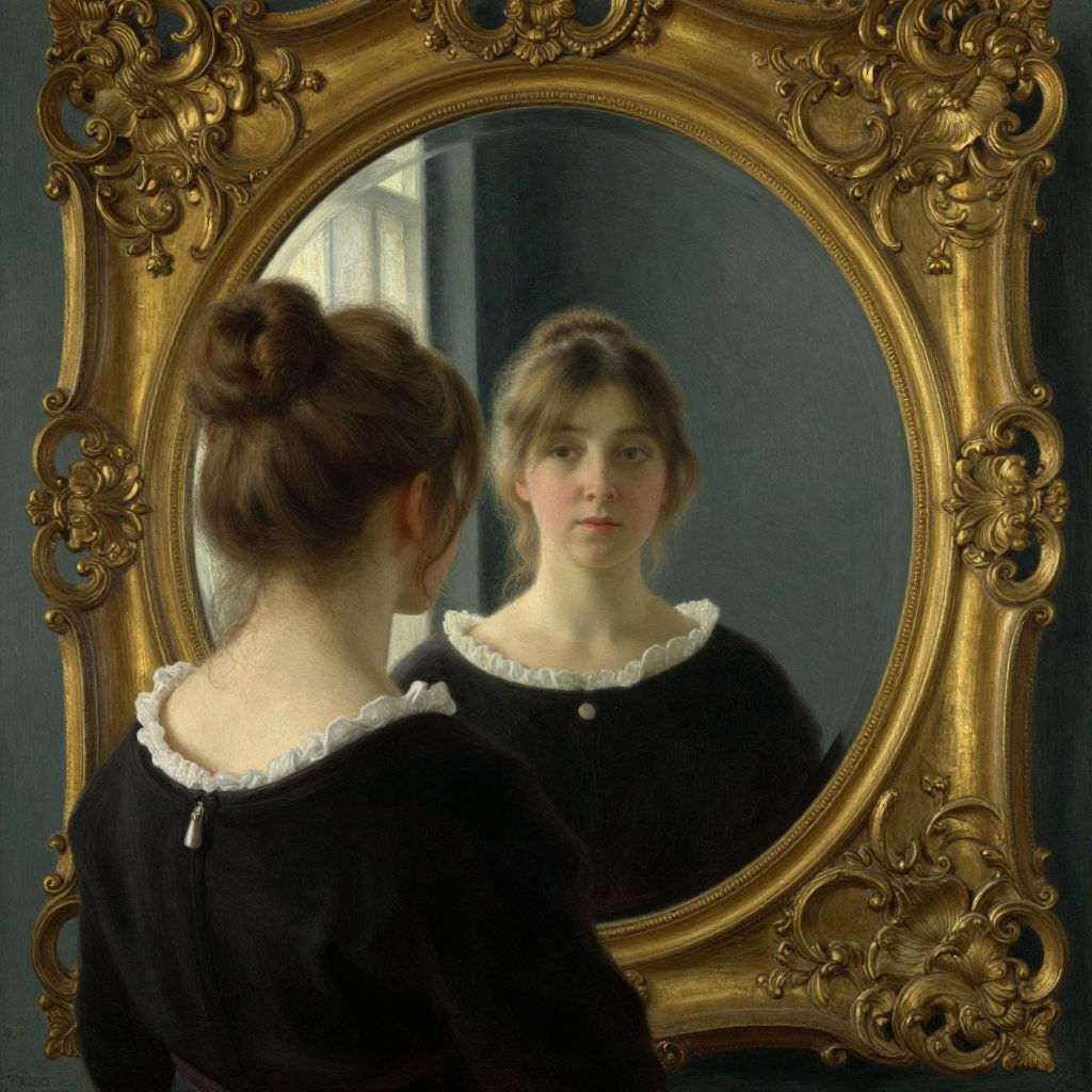 Realistic oil painting of a young woman with fair skin, brown hair in a bun, wearing a black dress with white lace, framed in a gold