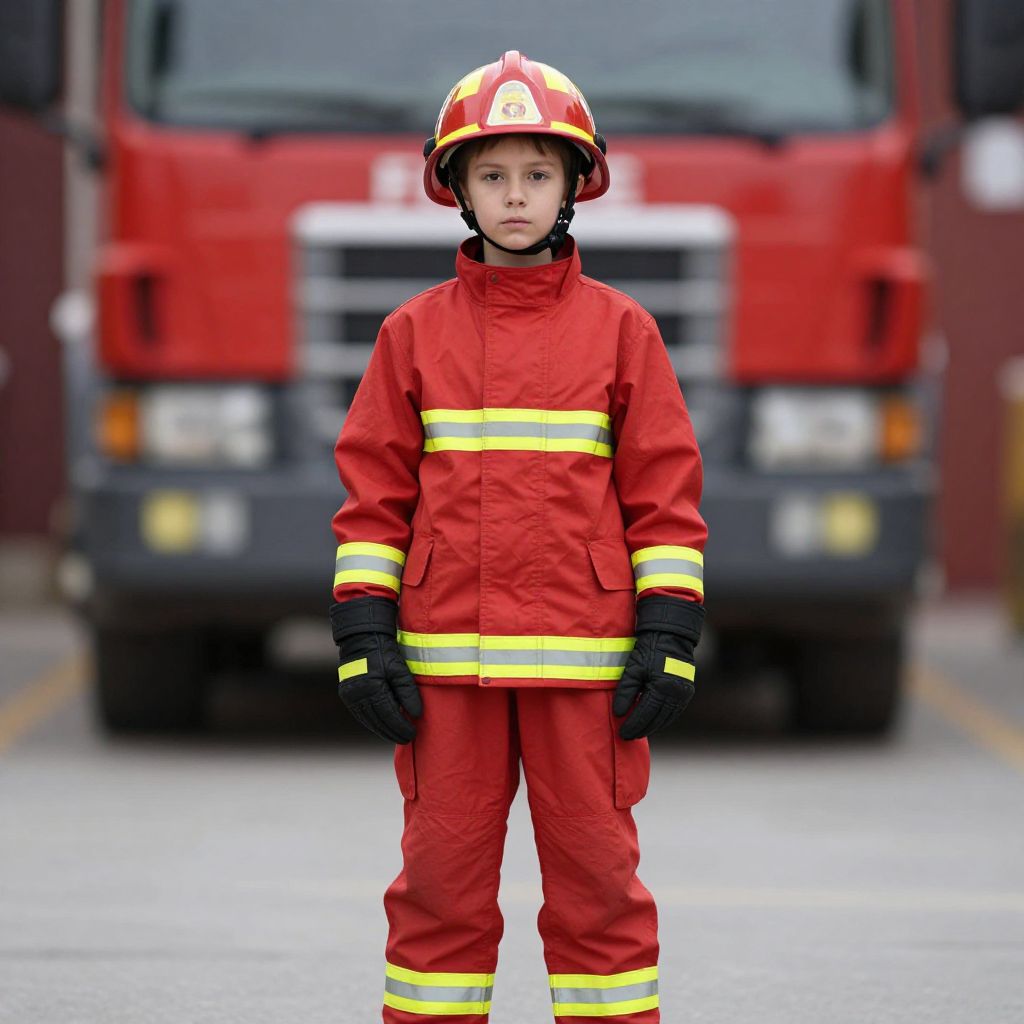 Photograph of a young boy in a red firefighter uniform and helmet standing in front of a red fire truck. Blurred background. Serious expression. Day