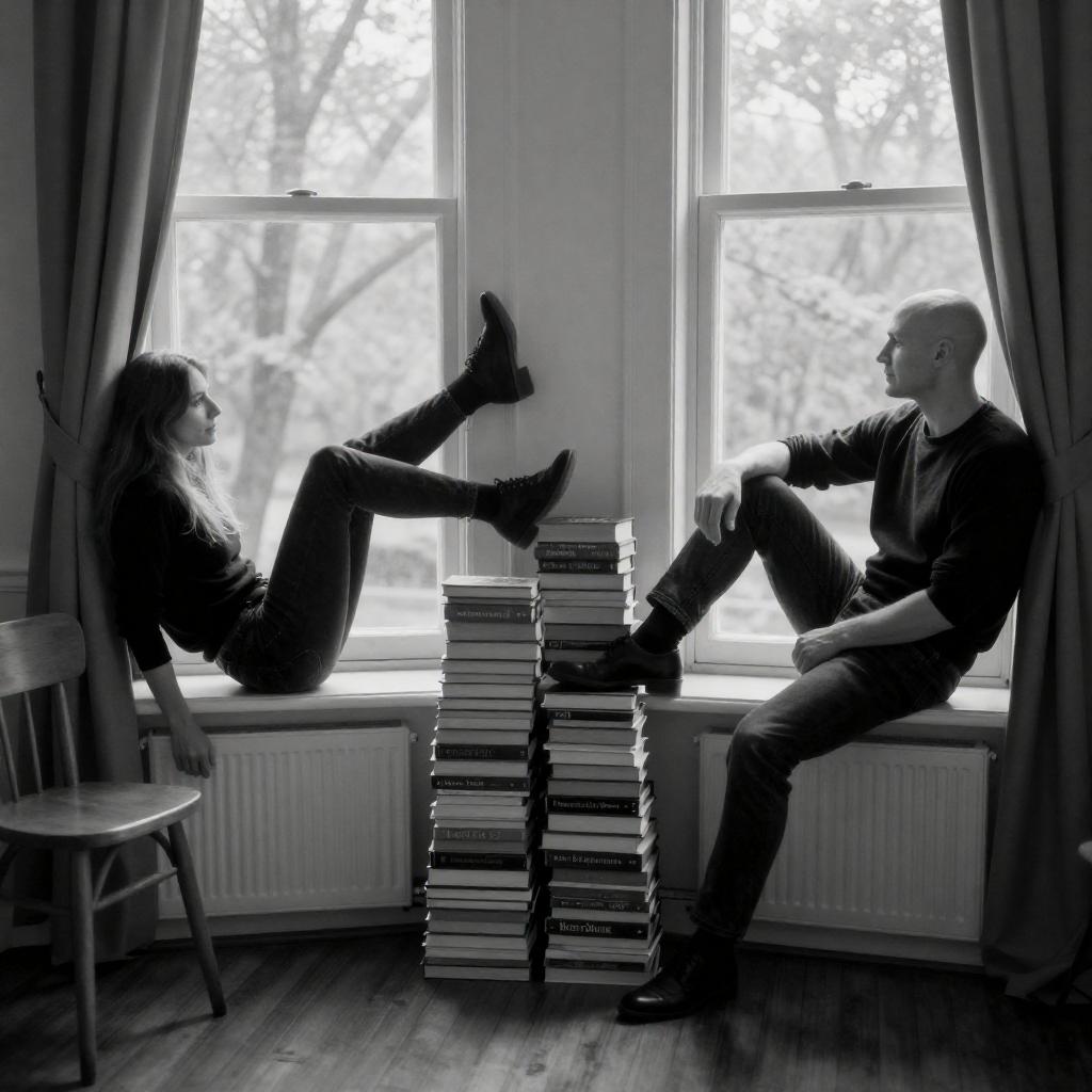 Black-and-white photograph of two people lounging on windowsills. Both wear dark clothes; one has long hair, the other is bald. Stacks of books in shelf between them. Curtains partially drawn. Sunlight filters through trees outside. Person on left leans back, legs up; person on right sits with arms resting on knee. Room has wooden floor, chair on left.