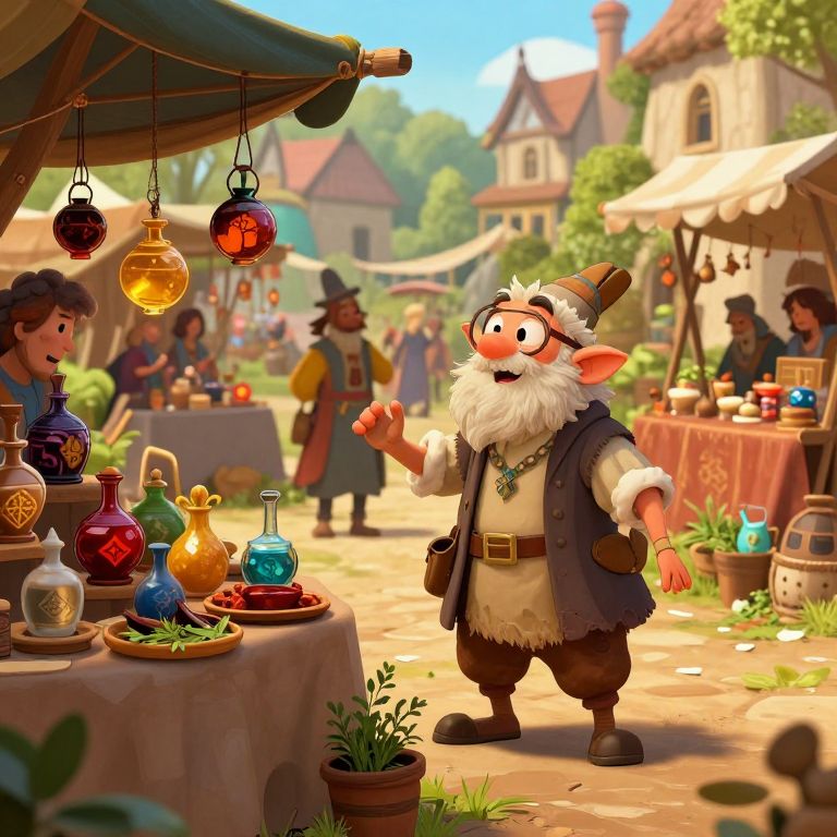 Gnoom engaging in a lively market scene filled with colorful stalls selling potions, herbs, and enchanted trinkets, bustling medieval fantasy setting with a warm color palette, detailed character expressions and vibrant environment design.