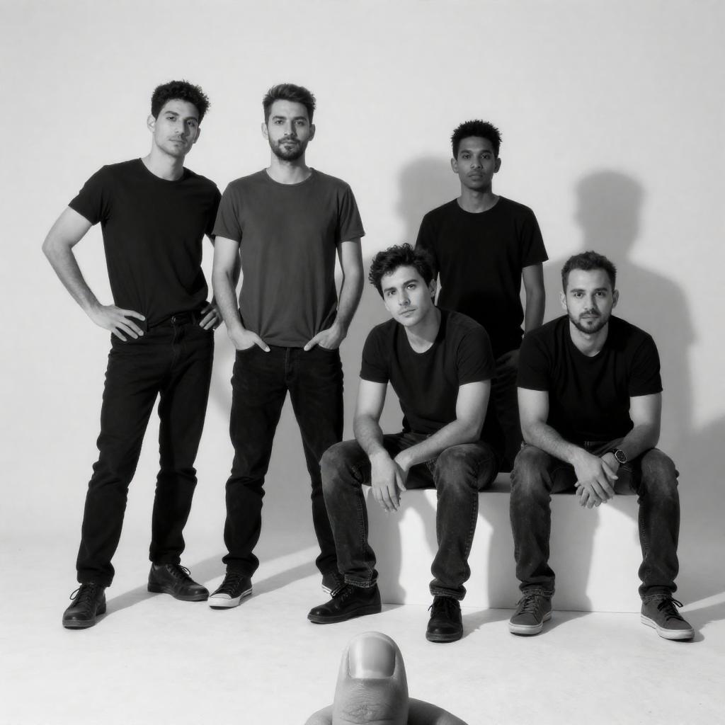 Photograph of three men in a dimly lit, industrial-looking room. They sit on a dark bench, wearing white shirts and casual shoes. The man on the left has green sneakers, the middle man has white sneakers, and the right man has dark shoes. They look at each other, with a metal frame in the foreground.
