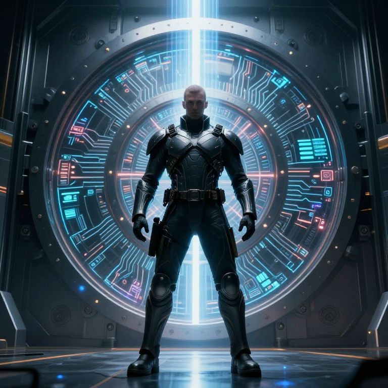 Cryptomanran, futuristic guardian standing in front of a massive digital vault door covered with blockchain circuit patterns, radiant light beams piercing the dark, epic and powerful stance, hyper realistic sci-fi art