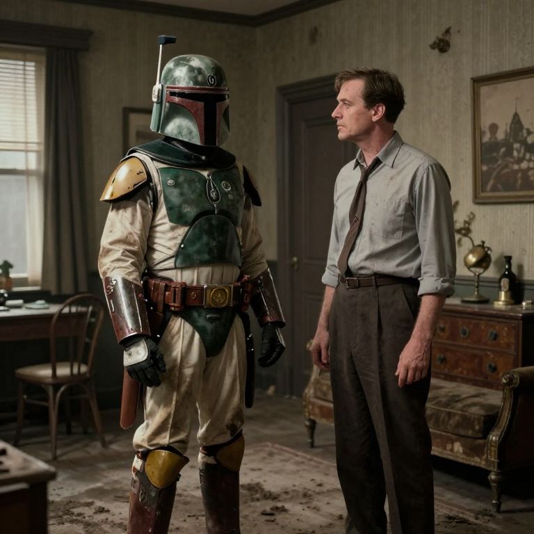 Jay Gatsby boba fett is being abandoned by his father. dirty nyc apartment. the year is 1952. realisitc. cinematic.vintage,no color,