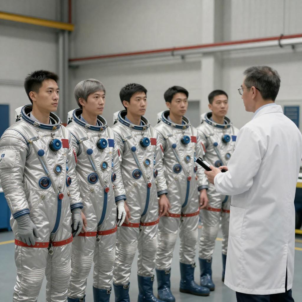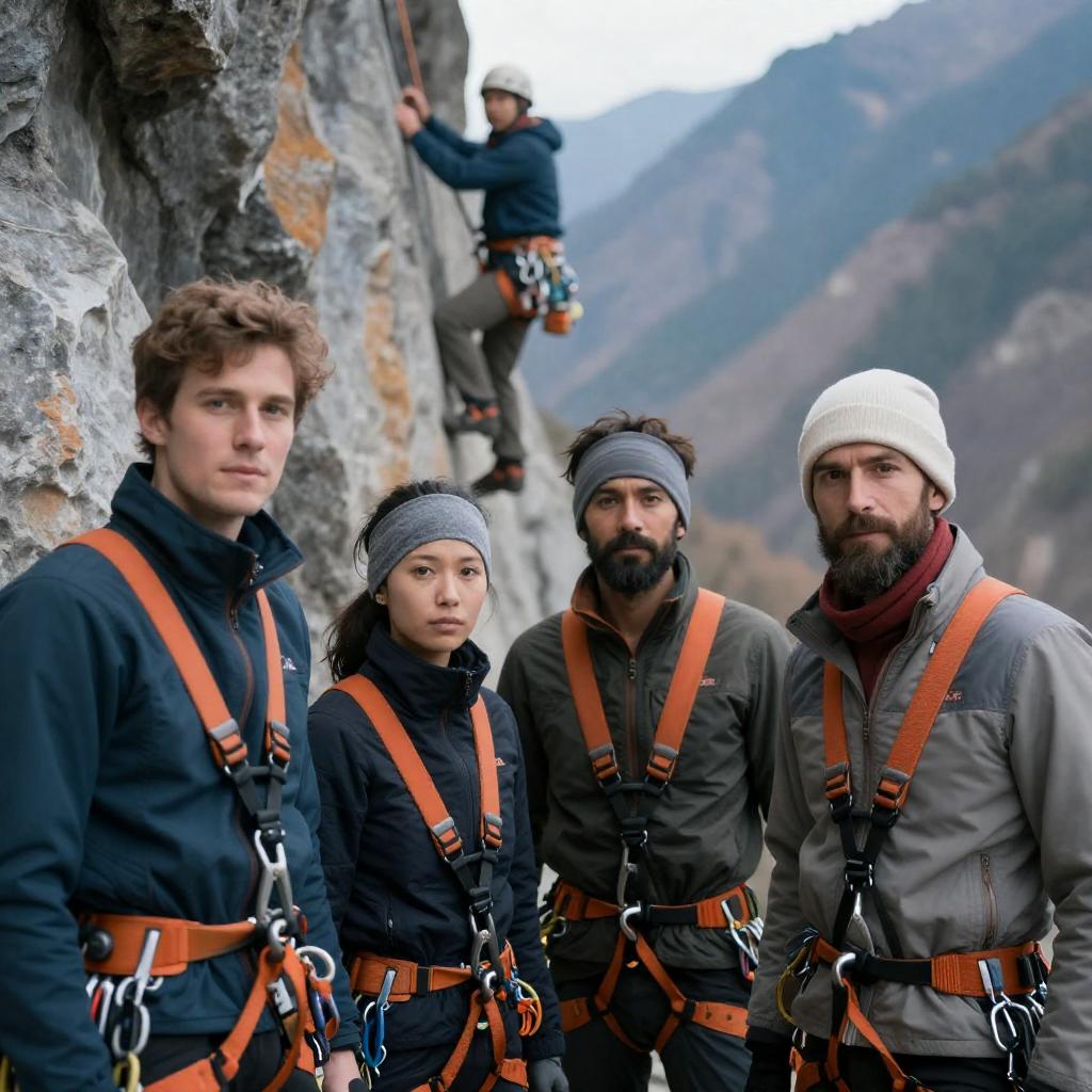 Photograph of five people standing in a row. They wear winter climbing gear with varying colors—blue, brown, red, yellow, and red-orange. All have helmets, gloves, and harnesses. Background is a blurred, dark mountain landscape. Each person has a serious expression. They stand with arms at their sides, facing forward.