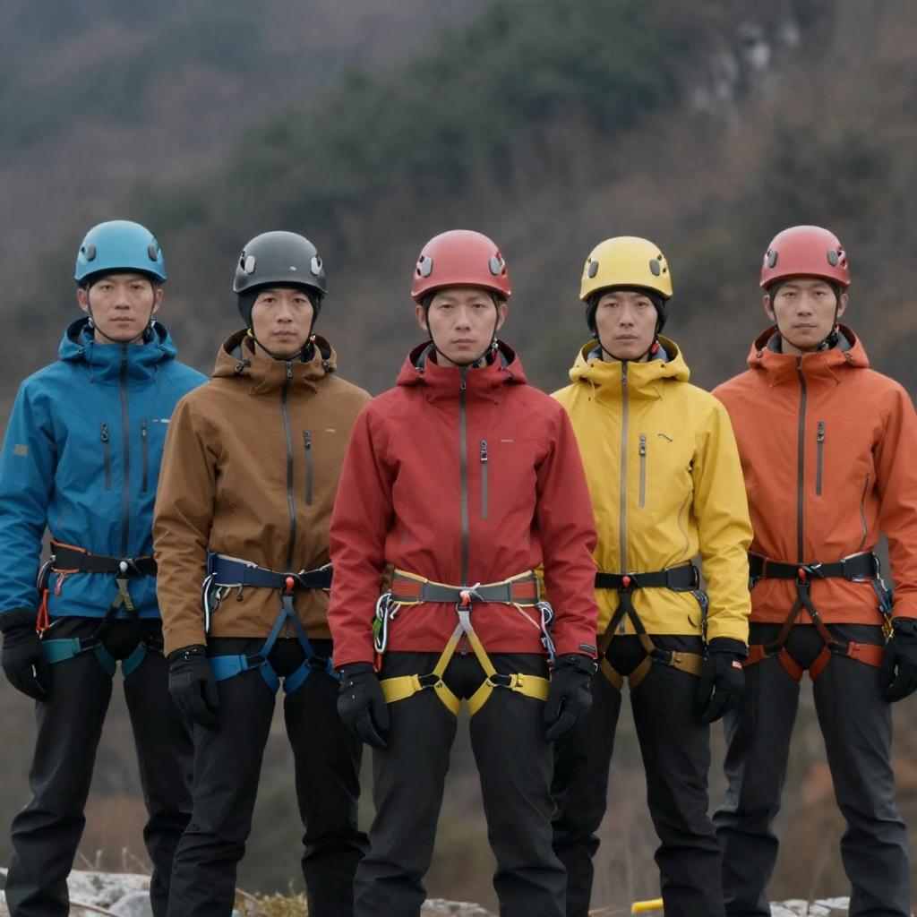 Five men wearing winter climbing gear stand in a row against a blurred mountain landscape. Each man wears a different colored jacket and helmet—blue, brown, red, yellow, and orange-red. They are equipped with safety harnesses and gloves, facing forward with serious expressions.