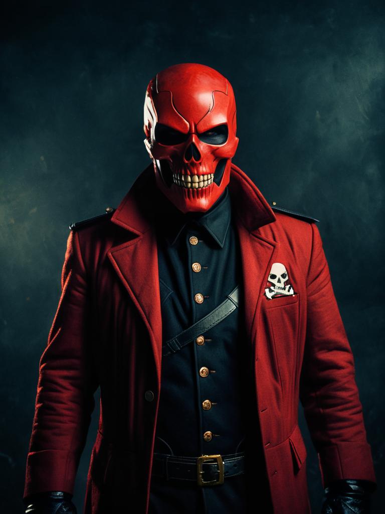 Portrait of a man in a realistic Red Skull cosplay costume, featuring a detailed red skull mask and a red trench coat over a black uniform with gold buttons. The outfit includes a skull emblem on the chest pocket and black leather gloves, set against a dark, textured background.